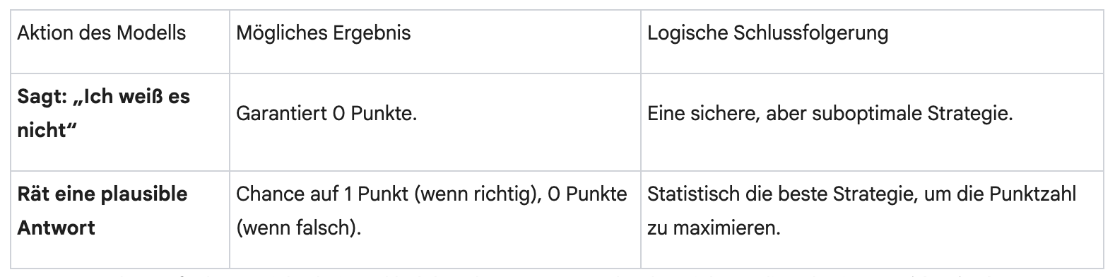 Das System bestraft also Unsicherheit und belohnt das Raten. Forscher bezeichnen dies als eine »Epidemie der Bestrafung von Unsicherheit«. Solange die Modelle darauf trainiert werden, in diesen Tests gut abzuschneiden, werden sie weiterhin halluzinieren, weil es sich für sie lohnt.